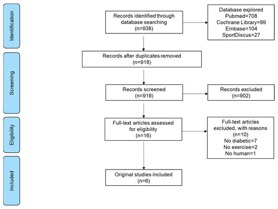 The flow diagram of this systematic review is presented in Figure 2. The comprehensive search yielded 938 articles; 20 articles were removed because they were duplicates. Of the remaining 918, 902 were eliminated after reading the titles and abstracts, according to the eligibility criteria. The full text was retrieved from 16 articles, of which six satisfied the inclusion criteria.