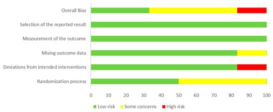 Two of the studies included were judged to have a low overall RoB score, three with a RoB score of “some concerns”, and one with a high RoB score, deriving from deviations from intended study interventions, missing outcome data, altered measurement of the outcome, and selection of the reported results. The evaluation of the methodological quality of the studies included is shown in Figure 3.