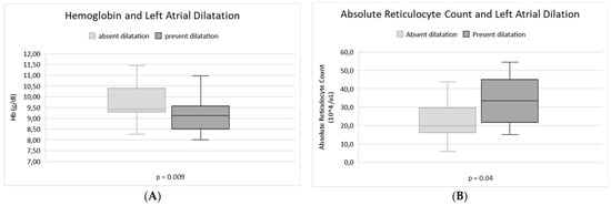 Correlation between LAD and markers of haemolytic anaemia. Box plot showing lower median Hb level (A), increased absolute reticulocyte count (B) in patients with left atrial dilatation compared to patients without this echocardiography alteration.