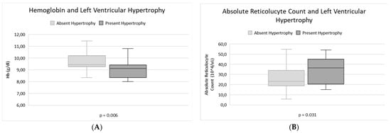 Correlation between LVH and markers of haemolytic anaemia. Box plot showing lower median Hb level (A), and increased absolute reticulocyte count (B) in patients with left ventricular Hypertrophy compared to patients without this echocardiography alteration.