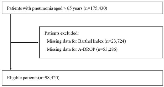 Within the 175,430 patients aged 65 years or older hospitalized for pneumonia, 77,010 were excluded due to missing BI scores (23,724 patients) or missing A-DROP data (53,286 patients). In total, we included 98,420 patients with pneumonia in the analysis (Figure 1).