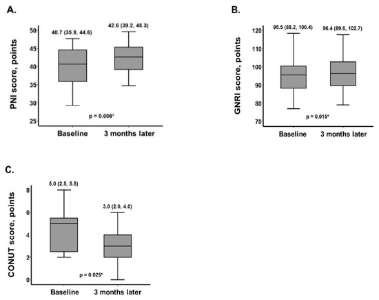 PNI score (from 40.7 [35.9, 44.6] points to 42.6 [39.2, 45.3] points) and GNRI score (from 95.5 [88.2, 100.4] points to 96.4 [89.6, 102.7] points) increased (i.e., improved) significantly at 3 months following the initiation of SZC therapy and liberation of potassium intake restrictions (p = 0.006 and p = 0.015, respectively; Figure 1a,b). CONUT score decreased (i.e., improved) significantly during the 3 month observational period from 5.0 (2.5, 5.5) points to 3.0 (2.0, 4.0) (p = 0.025; Figure 1c).