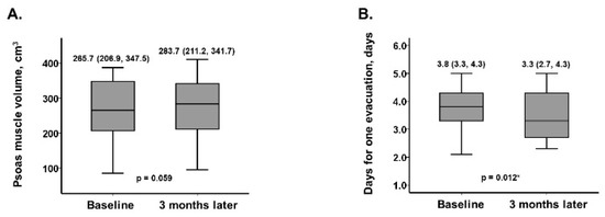Psoas muscle volume trended to increase from 265.7 (206.9, 347.5) cm3 to 283.7 (211.2, 341.7) cm3 (p = 0.059, N = 10, Figure 2a). Averaged days for one bowel movement decreased significantly from 3.8 (3.3, 4.3) days to 3.3 (2.7, 4.3) days (p = 0.012; Figure 2b). Trends in other laboratory data are displayed in Table 2. Serum albumin and lymphocyte count increased significantly (p = 0.025 and p = 0.040, respectively). Other variables remained unchanged (p >0.05 for all).