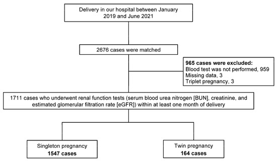This retrospective study involved 2676 deliveries performed at Japanese Red Cross Aichi Medical Center Nagoya Daiichi Hospital from January 2019 to June 2021. Preoperative tests such as blood tests (complete blood counts, biochemical tests including kidney and liver function tests, coagulation studies, and infectious disease screening including HIV), chest radiography, and electrocardiography were performed for all twin pregnancies and patients with a strong indication for cesarean section delivery within at least one month of planned delivery. After excluding 965 patients (including 959 cases in which blood tests were not performed, 3 cases of missing data, and 3 cases of triplet pregnancy), a final total of 1711 patients were enrolled in the study consisting of 1547 singleton pregnancies and 164 twin pregnancies, all of whom underwent the preoperative blood tests including renal function tests (serum blood urea nitrogen (BUN), creatinine, and estimated glomerular filtration rate (eGFR)) within at least one month of delivery (Figure 1). The study conformed to the principles outlined in the Declaration of Helsinki of 1964 and was approved by the Ethics Committee of the Japanese Red Cross Aichi Medical Center Nagoya Daiichi Hospital, Nagoya, Japan (approval number: 2021-422).