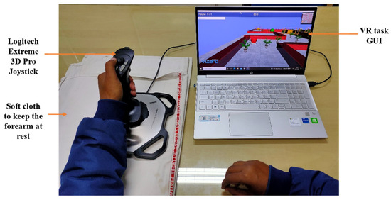 VR therapy was given for 20 sessions of 45 min of therapy (with 15 min of rest period) in the presence of an experienced physiotherapist. The patient was asked to comfortably sit straight on a chair and place their arm on the table, with their elbow at ~120 degrees (Figure 2). The patient was instructed to control the joystick movements using their wrist and fingers, with limited involvement of any proximal joints. A pillow/soft cloth was used for the purpose of keeping the forearm fixed, to minimize any compensatory movements.
