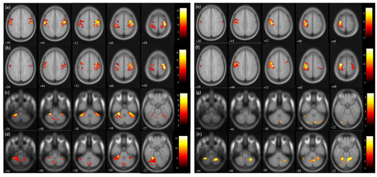 BOLD functional MR images for wrist extension task with voxel level threshold p < 0.05 (FWE corrected) and cluster level threshold of 5 voxels. Talairach-client was used to correlate MNI coordinates with gray and white matter. (a,c) pre-therapy activations and (b,d) post-therapy activations during affected hand trial; (e,g) pre-therapy activations and (f,h) post-therapy activations during unaffected hand trial for the masked regions of sensorimotor cortex (36:8:68 slices) and cerebellum (−54:8:−22 slices).