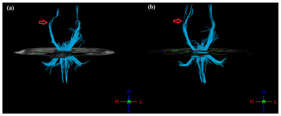 3D tractography images of CST of both hemispheres (a) pre- and (b) post-therapy. Post-therapy image of affected (right) hemisphere indicating denser and more intact tracts as compared to pre-therapy (indicated by red arrow mark).