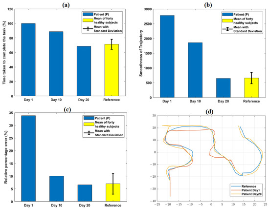 Variation in quantitative task-specific performance metrics: (a) TCT, (b) smoothness of trajectory, and (c) relative % error obtained from the patient (P) at day 1, 10, and 20 of VR therapy. A relative decrease in TCT, smoothness of trajectory, and relative % error values was observed from day 1 to day 20. The reference values shown were obtained from the average performance metrics of 40 healthy subjects in our earlier work. (d) shows qualitative trajectory plots for day 1 and 20 obtained from P. At day 1, the trajectory of P was incomplete; it became identical with that of a representative healthy subject (obtained from our previous work) at day 20.