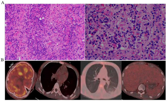 The diagnosis of HLH was established, and further causes were identified in the following aspects. Early recognition of the potential causes was critical to the treatment. Firstly, HLH was suspected to be caused by infection, but more than three times of cultures in blood, urine, stool, bone marrow, and BALF did not reveal any potential pathogens. The (1,3)-β-D-glucan test and galactomannan (GM) test in whole blood and BALF did not support a fungal infection. Metagenomic testing of blood and BALF for pathogens (based on the Illumina high-throughput sequencing platform with 18,562 microorganisms in the database) showed negative results for bacteria, fungi, viruses (DNA viruses and RNA viruses), parasites, mycobacterium tuberculosis, mycobacterium non-tuberculosis, pneumocystis carinii, mycoplasma, and chlamydia. Blood laboratory tests were negative for influenza A, influenza B, Epstein–Barr virus (EBV), cytomegalovirus (CMV), respiratory syncytial virus (HSV), coxsackievirus, and herpes simplex virus, and positive only for the influenza B virus IgM antibody. Secondly, the patient’s autoimmune antibodies, including the antinuclear antibody (ANA), extractable nuclear antigen (ENA), antineutrophil cytoplasmic antibody (ANCA), and anti-cardiolipin antibody, were normal. HLH-related rheumatoid immune diseases were excluded. Based on the laboratory results of the bone marrow, leukemia, lymphoma, and multiple myeloma were not considered. In terms of malignancy, lymph node changes caused by HLH were presented according to the pathological morphology and immunohistochemical results of the lymph nodes (Figure 3a). The tumor markers of this patient were all negative. Positron emission computed tomography (PET/CT) suggested bilateral axillary and retroperitoneal multiple small lymph nodes with nonspecific inflammatory hyperplasia and hepatomegaly. No obvious hypermetabolic metastases were observed in the body (Figure 3b). The patient was not taking any medication prior to the onset, thus ruling out drug-induced secondary HLH.