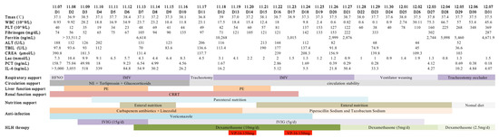 The patient received endotracheal intubation for invasive mechanical ventilation (IMV), norepinephrine and intravenous rehydration for blood circulation, plasma exchange (PE) for liver function, continuous renal replacement therapy (CRRT) for renal function support, and multiple blood products (fresh frozen plasma, platelets, and coagulation factors) for improving coagulation.