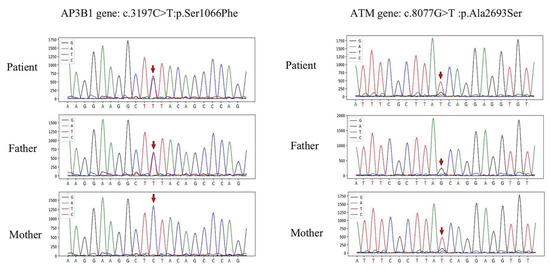 The mutation sites in this patient include the AP3B1 variant c.3197C > T and the ATM gene c.8077G > T, both of which are newly identified variants, the former from the father and the latter from the mother.