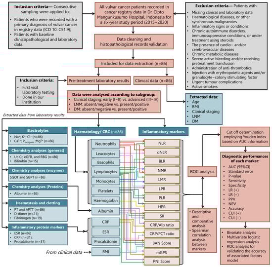 The value of inflammatory markers has been assessed as prognostic factors in a variety of human cancers, including gynaecological malignancies like ovarian [,,], cervical [,,], endometrial [], and uterine cancer []. However, only limited evidence has explored inflammatory indicators of VC; one study by Ertas et al. [] solely assessed the role of neutrophil-to-lymphocyte ratio (NLR) and platelet-to-lymphocyte ratio (PLR) in determining lymph node involvement. However, that study did not research the use of inflammatory markers in predicting advanced clinical staging and DM. Furthermore, a thorough study on the clinical profile and baseline laboratory data of VC patients in Indonesia was not performed. Arising from these research gaps and preparedness to uncover a non-invasive and easy-to-use pre-operative test to estimate the patients’ clinical outcomes, we aimed to determine whether pre-treatment inflammatory markers can be used as associative markers for advanced-stage disease, LNM, and DM in patients with VC.