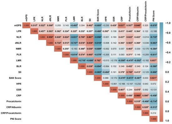The correlation matrix between inflammatory surrogate marker metrics was depicted as a heatmap, measured using Spearman rank correlation analysis. The heat map represents the colour-coded correlation factors between all markers. The colour value of the cells is proportional to the strength of the associations, ranging from red (positive correlations) to blue (negative correlations). The strength of the correlation is indicated in the colour scale (at the right of the panel), where 1 shows a strong positive correlation, −1 shows a strong negative correlation, and 0 shows no correlation. Pair-wise-Spearman correlation coefficients (ρ) are shown in every cell. A p-value correlation between two inflammatory markers was described as a p < 0.001; b p < 0.01; and c p < 0.05, and others without superscripts were denoted as non-significant (p > 0.05).