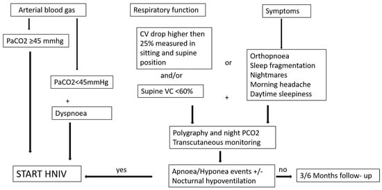 Shows possible management of patients affected by Neuromuscular disease. Arterial blood gas (in particular, PaCO2 levels), combined with respiratory function and symptoms, may suggest the right time to introduce HNIV. If the patient presents with normocapnia, with compromised vital capacity (VC) or nocturnal symptoms, a polygraphy and PCO2 trancutaneous monitoring should be performed to identify a nocturnal hypoventilation and other important criteria to start HNIV.