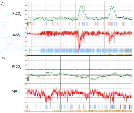 Shows transcutaneous monitoring of a patient with ALS during spontaneous breathing (A) and during HNIV (B). In (A) note a progressive increase of PtCO2 at the start of recording time and two further abrupt increases that may represent the REM stage of sleep. SpO2 trace shows recurrent oxygen desaturation events (likely apnea/Hypopnea events) during the night with two longer and more profound oxygen desaturations (likely REM-related alveolar hypoventilation). During HNIV (B) the PtCO2 is stable around a normal value and SpO2 has significantly improved.