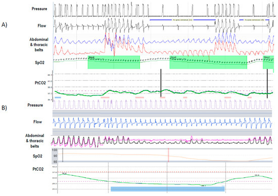 Shows upper airway obstruction (UAO). (A) Without reduction of ventilatory drive: (1) sudden reduction in flow amplitude; (2) phase opposition in thoracic and abdominal belts; (3) decrease in SpO2 15 sec after the UAO; (B) with decrease in ventilatory command: (1) progressive decrease in flow; (2) significant reduction/disappearance of thoracoabdominal movements and change to back-up ventilation indicating upper airway closure with reduced ventilatory command; (3) a significant reduction of PtCO2 preceded the event.