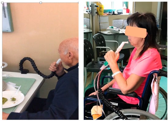 Two photographs of patients using mouthpiece ventilation (MPV). The left-hand picture shows an open MPV circuit; the patient breathes in via the circuit and then disengages from the mouthpiece to breathe out. The picture on the right shows an MPV circuit with an exhalation valve; in this situation, the patient can breathe in and out via the circuit. The exhaled air will be via the exhalation valve.
