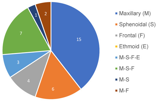 - Alasmari, D.S.; Mohan, M.P.; Almutairi, A.S.; Satheeshkumar, P.S. Para Nasal Sinuses are Pneumatized in a Synchronized Pattern, a Study Evaluating Volume of the Maxillary and Sphenoid Sinuses using Cone Beam Computed Tomography. Int. J. Contemp. Med. Res. 2019, 6, 587–590. [Google Scholar]