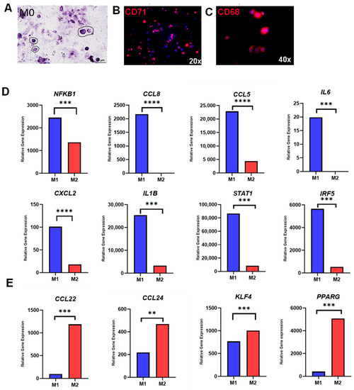 Monocyte-to-macrophage differentiation and polarization. (A) Representative M0 macrophages with HE-staining (40× magnification); (B) Immunofluorescence staining of M0 macrophages with CD71 (20× magnification); (C) Immunofluorescence staining of M0 macrophages with CD68 (40× magnification); (D) Relative gene expression of M1-associated genes (NFKB1, CCL8, CCL5, IL6, CXCL2, IL1B, STAT1, and IRF5); and (E) Relative gene expression of M2-associated genes (CCL22, CCL24, KLF4, PPARG). * p < 0.05, ** p < 0.01, *** p < 0.001 and **** p < 0.0001.