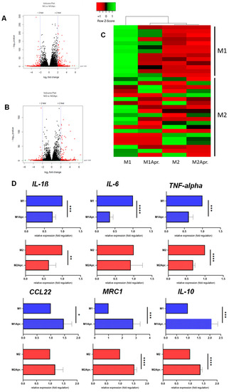 Having established a successful in vitro polarization of M1 and M2 macrophages, it was next thought to test the effect of Apremilast on macrophage polarization. The M1 and M2 macrophages were treated with Apremilast, and subsequently analyzed by RNAseq and selected genes by qPCR. Volcano Plots show differentially expressed genes (DEG) between groups (Figure 2A,B). In more detail, among the 58,396 analyzed genes, 13% (7690) were differentially expressed when comparing M1 macrophages with M1 macrophages treated with Apremilast. Thereof, 56% were upregulated and 44% were downregulated. Further, 17.5% (10,231) of all analyzed genes showed significant differences when comparing M2 macrophages with M2 macrophages treated with Apremilast. Out of these, 5170 (50.5%) DEGs were significantly upregulated and 5061 (49.5%) were significantly downregulated. Hereby, we could demonstrate a clear effect of Apremilast on M1 and M2 macrophage gene expression.