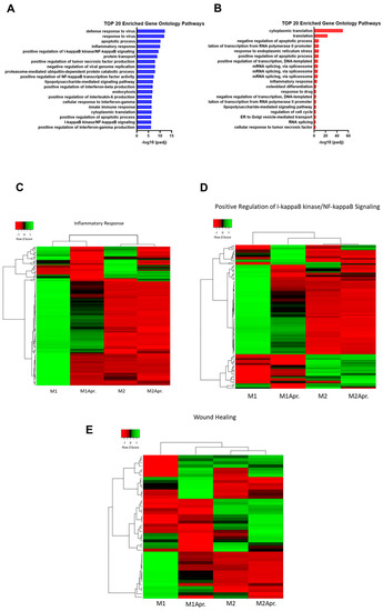 Pathway analysis of M1 and M2 Macrophages with or without Apremilast treatment. (A) Top 20 enriched Gene Ontology Pathways (biological process) of upregulated genes comparing untreated M1 with Apremilast-treated (M1Apr) M1 macrophages. (B) Top 20 enriched Gene Ontology Pathways (biological process) of upregulated genes comparing untreated M2 with Apremilast-treated (M2Apr) M2 macrophages. (C) Differentially expressed genes of GO:0006954 (inflammatory response) were plotted in a heatmap. Expression levels are depicted according to the color scale in the top left corner. Row scaling and hierarchical clustering on the Pearson distance was performed. The hierarchical clustering is visualized by the dendrogram at the top, which illustrates the degree of relatedness in gene expression between samples. Complete list of genes shown in Table S1. (D) DEG of GO:0043123 (positive regulation of I-κB kinase/NF-κB signaling) was plotted in a heatmap. Expression levels are depicted according to the color scale in the top left corner. Row scaling and hierarchical clustering on the Pearson distance was performed. The hierarchical clustering is visualized by the dendrogram at the top, which illustrates the degree of relatedness in gene expression between samples. Complete list of genes shown in Table S1. (E) DEG of GO:0042060 (wound healing) was plotted in a heatmap. Expression levels are depicted according to the color scale in the top left corner. Row scaling and hierarchical clustering on the Pearson distance was performed. The hierarchical clustering is visualized by the dendrogram at the top, which illustrates the degree of relatedness in gene expression between samples. Complete list of genes shown in Table S1.