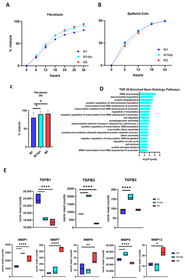 Influence of paracrine factors from untreated M1, Apremilast-treated M1, and untreated M2 on cell migration. (A) Wound closure (%) of epithelial cells incubated with conditioned medium of either untreated M1/M2 macrophages or Apremilast-treated (M1 + Apr.) M1 macrophages for 24 h. (B) Wound closure (%) of fibroblasts incubated with conditioned medium of either untreated M1/M2 macrophages or Apremilast-treated (M1 + Apr.) M1 macrophages for 36 h. (C) Wound closure (%) of fibroblasts at time point 36 h. * p < 0.05. (D) Top 20 enriched Gene Ontology Pathways (biological process) of upregulated genes (M1Apr macrophages). (E) Normalized read count of Transforming Growth Factors (TGFB1, TGFB2, and TGFB3) and Matrix Metalloproteinases (MMP1, MMP7, MMP8, MMP9, and MMP12) for untreated M1, Apremilast-treated M1 (M1Apr), and untreated M2 macrophages. * p < 0.05, ** p < 0.01 and **** p < 0.0001.