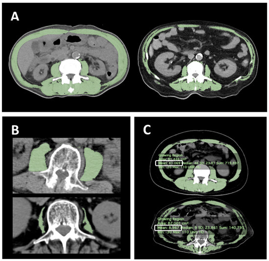 - Mourtzakis, M.; Prado, C.M.; Lieffers, J.R.; Reiman, T.; McCargar, L.J.; Baracos, V.E. A practical and precise approach to quantification of body composition in cancer patients using computed tomography images acquired during routine care. Appl. Physiol. Nutr. Metab. 2008, 33, 997–1006. [Google Scholar] [CrossRef]