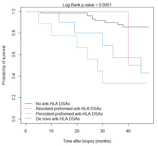 Patients were divided post hoc into four groups according to their DSA status at the time of biopsy: no anti-HLA DSAs, resolved preformed anti-HLA DSAs, persistent preformed anti-HLA DSAs, and de novo anti-HLA DSAs.