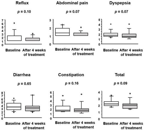 Gastrointestinal symptoms including reflux, abdominal pain, dyspepsia, diarrhea and constipation was evaluated using a gastrointestinal symptom rating scale (Figure 3). Overall, gastrointestinal symptoms showed a marked tendency for improvement by BBG9-1 treatment (p = 0.09). The observed improvements in abdominal pain and dyspepsia reached an almost significant level (p = 0.07 and p = 0.07, respectively).