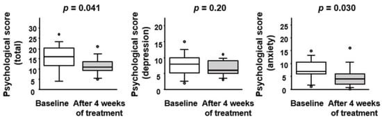Using the HADS questionnaire, we evaluated in more detail the mental status of patients with qCD and IBS-D-like symptoms (Figure 5). Although the depression score did not differ between the baseline (8 [5–10]) and the endpoint of BBG9-1 treatment (6 [5–9]), the anxiety score was significantly lower at the endpoint (4 [2–6]) than at the baseline (7 [6–11]). The total HADS score was significantly lower at the endpoint (11 [9–14]) than at the baseline (16 [11–21]).