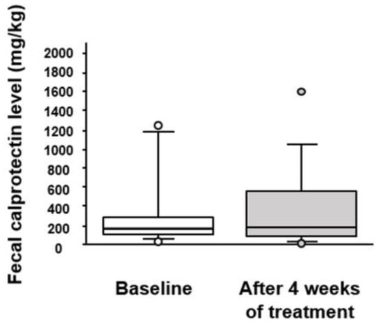 To assess the change in the inflammatory condition of the intestinal environment in patients with qCD and IBS-D-like symptoms, we measured the level of fecal calprotectin (Figure 6). This revealed that the fecal calprotectin level before BBG9-1 treatment (165.0 [94.6–305.0] mg/kg) did not differ significantly from that after treatment (185.0 [86.0–644.0] mg/kg).