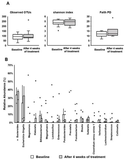 Effect of BBG9-1 on the gut microbiome profile in patients with qCD and IBS-D-like symptoms. (A) Diversity of the gut microbiome. (B) Relative abundance of intestinal bacteria at the genus level. Results are shown as median and inter-quartile range. White dot is an outlier. Significant differences between the baseline and after 4 weeks of treatment at * p < 0.05. OTUs, operational taxonomic units; PD, phylogenetic diversity.