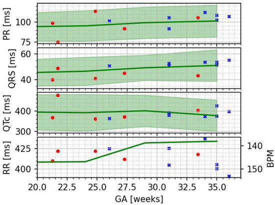 Our results are in good agreement with those from prior OPM-based studies of normal fetuses. As it was previously shown that SQUID- and OPM-based fMCG data are equivalent [20], we could use normative values from large SQUID data sets to confirm that our data are within expected ranges (Figure 2). Future work will include comparative OPM/SQUID measurements in individual pregnancies to improve statistical comparisons. Our data also show that the PR and QRS intervals increase with gestational age, in agreement with prior published studies [20,21,22].