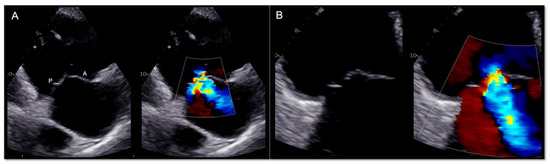 The first step is represented by the introduction and advancement of the delivery system into the right atrium (RA), guided by the bicaval view with biplane imaging [51]. For the PASCAL system, it is important, after checking the delivery system tip position (1–2 cm into the RA from inferior vena cava), to monitor the safe introduction of the elongated device, avoiding trauma to the surrounding structures and to image implant closure and shortening, necessary to reduce the risk of injuries [26]. ME and DE RV inflow/outflow (TV “commissural” views) direct the delivery system toward the TV, carefully avoiding interatrial septum perforation, and guide the preliminary device position using color Doppler. TG short-axis view using color Doppler and 3D en face views are important to confirm implant and arms orientation and rotation along the commissure line and advance into the RV with continuous rotation monitoring [52]. The clasping phase (capture of leaflets) is mainly supported by the commissural view with biplane imaging (Figure 10), slightly adjusting the secondary plane toward the aorta in case of anteroseptal grasping or away from the aorta in case of posteroseptal grasping [51]. Furthermore, 3D imaging and multiplanar reconstructions can be used for the confirmation of adequate leaflets insertion [26,52]. When adequate tissue bridge, leaflets insertion, and implant position are defined, three assessments have to be checked before the device release through 2D and 3D commissural and TG views: residual TR severity (by color Doppler and by 3D color Doppler planimetry of the vena contracta), residual TV orifice area, and gradient (≤3 mmHg acceptable) and hemodynamic benefit through hepatic venous inflow. In this phase, prior to release, any repositioning can be performed. The same parameters have to be checked in post-release assessment. At this point, the possible need for a second implant in the same intervention must be assessed [26,51].