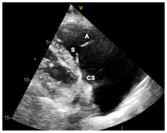 Transthoracic echocardiogram in two dimensions. If the muscular interventricular septum along with the coronary sinus (CS) ostium are seen, then the leaflets visualized are the septal (S) and the anterior (A).