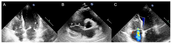 Transthoracic echocardiogram in two dimensions. (A) Apical four-chamber view: the septal leaflet (S) is seen adjacent to the septum and the anterior leaflet (A) adjacent to the right ventricular free wall; (B) Parasternal short-axis view: the anterior leaflet (A) is visualized next to the aorta and the posterior leaflet (P) on the opposite site, adjacent to the right ventricular free wall; (C) Apical four-chamber view with color-Doppler documenting tricuspid regurgitation (white arrow).
