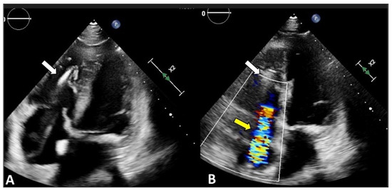 Cardiac implantable electronic device (CIED)-related tricuspid regurgitation (TR). Transthoracic echocardiogram, apical four-chamber view documents CIED RV lead (A,B, white arrows) and RA lead that cause relevant TR visible with Color-doppler (B, yellow arrow).