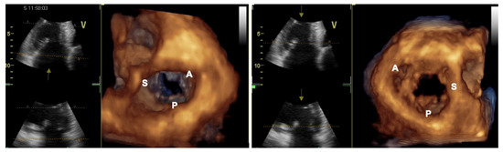 Considering the TV anatomic variability, 3D imaging is crucial for pre-procedural planning as it has higher accuracy in the identification of the number and location of the leaflets. Leaflets identification is based on the surrounding anatomy, with the aorta adjacent to the anteroseptal commissure and the coronary sinus adjacent to the posteroseptal commissure. A 3D en face TV view is acquired from the 2D commissural view and may be realized in two different orientations: with Z rotation (180° rotation) to obtain a “surgeon’s view” with aorta and anterior leaflet on top (Figure 9), or without Z rotation to obtain the “interventionalist’s view” with the aorta in the far field at 5 o’clock, the anterior leaflet in the far field next to the aorta, the posterior leaflet in the near field, and the septal leaflet on the right side, close to the interventricular septum. The interventionalist’s view is often preferred because it is similar to the TG short axis view, the only 2D view that simultaneously shows all three leaflets and measures the coaptation gap [25,26]. Furthermore, 3D multiplanar reconstructions (MPR) performed in real time or off-line may help to better define leaflet lengths (≥8 mm for a favourable clasping) and mobility, coaptation gaps, and the regurgitant orifice location to plan the intervention [17]. Leaflet insertion should be located ≥6 and ≥9 mm for NTR and XTR TriClip, respectively [27].