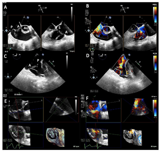 Transesophageal echocardiogram two-dimensional views (A,B): RV inflow-outflow view with biplane imaging; (C,D) deep esophageal 0° view) and multiplanar views (E,F) documenting flail anterior leaflet determining malcoaptation and severe tricuspid regurgitation with color Doppler (B,D,F). Ao = aorta, P = posterior leaflet, A = anterior leaflet, S = septal leaflet.