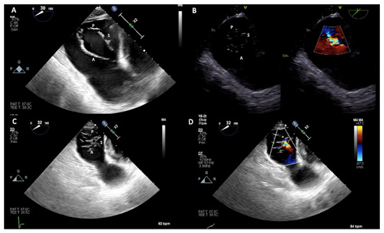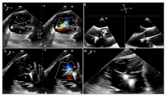 Two-dimensional transesophageal echocardiogram transgastric (TG) views. (A) TG short axis 30° documenting all three tricuspid valve leaflets in the open position during diastole; (B) in another patient, TG short axis 47° also with Color Doppler that documented functional tricuspid regurgitation due to leaflets tethering; (C) in another patient, TG short axis 32° also with color Doppler (D) with closed leaflets during systole documenting malcoaptation, especially between the anterior and septal leaflets, determining tricuspid regurgitation. The anterior leaflet (A) is in the far field, the posterior leaflet (P) is in the near field, and the septal leaflet (S) is on the right.