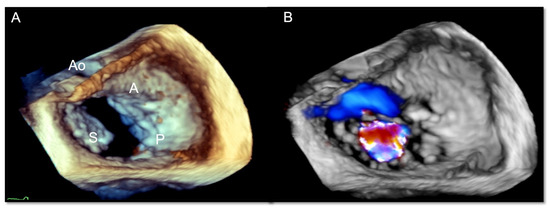 Transesophageal echocardiogram. (A) 3D en face imaging of the tricuspid valve acquired from a mid-esophageal commissural view with Z rotation: this is called the “surgeon’s view” and images the aorta and anterior leaflet (A) on top; (B) with Color Doppler documenting severe tricuspid regurgitation (TR). A = anterior leaflet, S = septal leaflet, P = posterior leaflet.