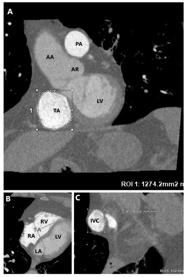 Assessment of TA dimensions by Cardiac Computed Tomography performed with a specific right–sided opacification protocol and by using multiplanar planes. (A) A planar cross-sectional area (short-axis) of TA that allows measurements of the TA area, perimeter, anteroposterior, and septal- lateral diameters. (B) Right-chambers morphology for the measurement of distance between the TA and the RV apex. (C) A transverse plane of the IVC. TA = tricuspid annulus, LV = left ventricle, AR = aortic root, AA = ascending aorta, PA = pulmonary artery, RA = right atrium, RV = right ventricle, LA = left atrium, IVC = inferior vena cava.