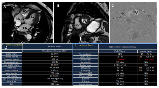 Cardiac magnetic resonance allows for the assessment of right ventricular (RV) function and tricuspid valve regurgitation by cine-imaging. (A) Four-chamber view of the heart. (B) Short-axis view of RV and LV. (C) Q-Flow sequences (example of pulmonary artery Q-flow assessment). (D) A typical analysis results table for Pulmonary Q Flow and RV function with important parameters for pre-procedural and post-procedural assessment. RA = right atrium, RV = right ventricle, LA = left atrium, LV = left ventricle, TA = tricuspid annulus, PA = pulmonary artery.