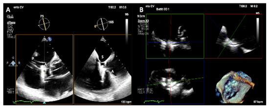 Intra-procedural monitoring by transesophageal echocardiography. (A) Right ventricular inflow-outflow view with biplane imaging to monitor septal (S) and anterior (A) leaflets grasping and (B) live 3D multiplanar reconstruction. A = anterior leaflet, S = septal leaflet, P = posterior leaflet.