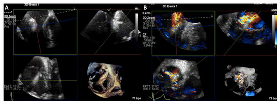 Intraprocedural transesophageal echocardiography. Multiplanar views and derived 3D reconstructions (A), and with color Doppler in (B) are crucial to help correct clip positioning.
