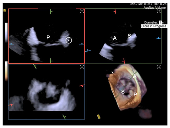 4D Volume ICE Multiplanar reconstruction of the tricuspid valve. The marker indicates the aorta. P = posterior leaflet; A = anterior leaflet; S = septal leaflet.