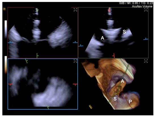 4D Volume ICE Multiplanar reconstruction of the tricuspid valve used to optimize clip trajectory. A = anterior leaflet; S = septal leaflet; P = posterior leaflet.