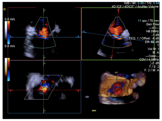 Until recently, the use of ICE for structural heart procedures has been limited by the presence of only 2D imaging planes, lower color Doppler quality, and volume size capability, and by the need for considerable catheter manipulations to visualize the target cardiac structures [61]. Enhancements in ICE technology have developed new 4D volume catheters that now allow biplane, 3D, and multiplanar reconstructions (Figure 15, Figure 16 and Figure 17), as well as co-registration with fluoroscopy; in addition, new catheters also present increased stiffness, that allows for a more stable catheter position [57].