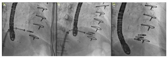 Four main fluoroscopic projections are described for the right chambers. The right heart one-chamber short axis view is obtained by placing the C-arm in a left anterior oblique view or “LAO” with a variable degree of caudal angulation (average LAO 55°/CAU 15°); it shows the “enface” view of the TV seen from the RV side, mimicking the 3D echo “enface” view, and is used to navigate the catheter to the target structure; it also visualizes the trajectory of the right coronary artery and its distance from the TA, as well as the trajectory of the coronary sinus [40,62,63]. The right heart two-chambers view is obtained by placing the C-arm in a RAO projection with a variable degree of caudal angulation (average RAO 60°/CAU 50°); this view allows for the identification of the anchorage of the anterior and posterior TV leaflets to the atrioventricular junction and widens the separation between papillary muscles, avoiding subvalvular apparatus entanglement and chordae injuries with coaptation devices [40]; moreover, in this view the IVC orifice and the TV are in plane, so it is helpful to guide delivery catheters from the IVC across the TV and into the TV inflow tract. The right heart three-chambers view is obtained by orienting the C-arm in a right anterior oblique view or “RAO” with a variable degree of cranial angulation (average RAO 25°/CRA 15°); it is directed along the long axis of the RV, allows visualization of the attachments of the posterior and septal leaflets, and is used to evaluate the device’s trajectory and its co-axiality with the tricuspid annulus. Finally, the four-chambers view is obtained by orienting the C-arm in a LAO projection with marked cranial angulation (average LAO 5°/CRA 60°); it enables the view of the anterior and septal leaflet attachments and appreciates the TV annulus and atrial septum both in plane) [40,63].