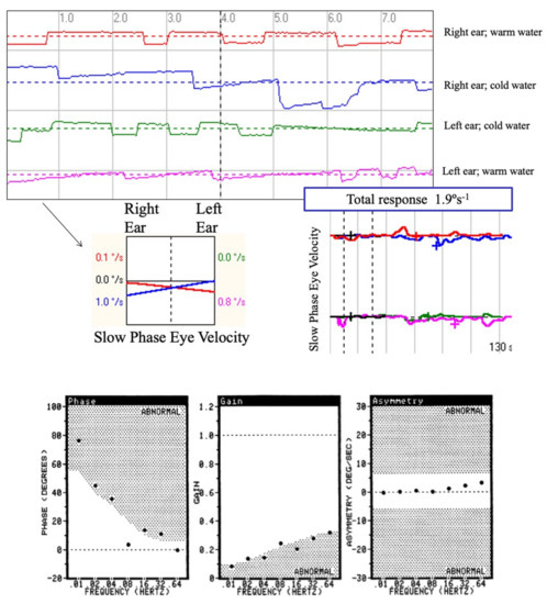 Rotatory chair test. This was performed using a CHARTR-RVT system (ICS Medical Corporation, Schaumburg, IL, USA). The rotatory chair is housed in an enclosure to perform the test in the dark. The head is positioned so that both horizontal canals are close to the plane of stimulus (i.e., at the gravitational horizontal). In the first impulsive rotational test, the patient was subjected to velocity steps to the right and left. The velocity steps involved the patient undergoing an angular acceleration of 100 s−1 for 1 s, rotation at a constant velocity for 60 s, and finally a deceleration to 0 s−1 within 1 s. This procedure was performed three times in a clockwise direction and three times in a counterclockwise direction, and the TC for each was averaged (TCave). In the sinusoidal harmonic acceleration test (SHA), the individual was subjected to sinusoidal oscillation about a yaw axis at various frequencies (0.01, 0.02, 0.04, 0.08, 0.16, 0.32, and 0.64 Hz), with a peak angular velocity of 50 s−1. From the chair velocity and slow-phase eye velocity, two parameters of the VOR were calculated: phase and gain. To confirm the findings of bilateral reduced response in the caloric test, the TCave had to be below 8 s and the SHA test, gain and phase had to be significantly lower than normal in at least three consecutive frequencies (Figure 1).